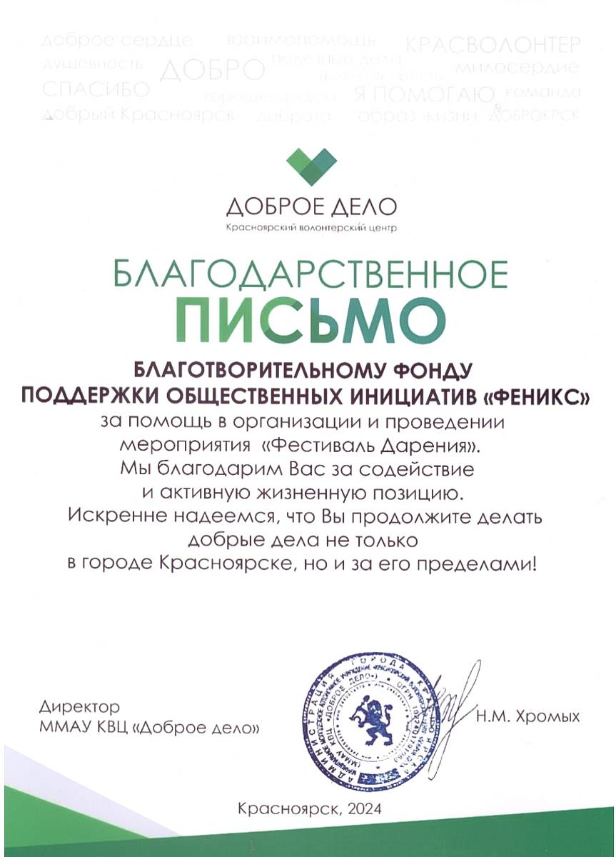 Наш президент Федюнин Василий Леонидович является председателем комиссии "Общество" Общественной палаты г.Красноярск Мы абсолютно открыты к инициативам, которые будут рождены за пределами нашего фонда, мы всячески готовы оказать содействие и поддержку всем амбициозным важным социальным проектам и их идейным вдохновителям.
